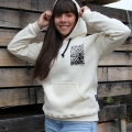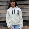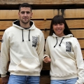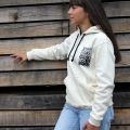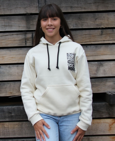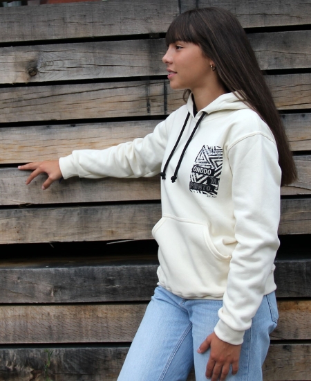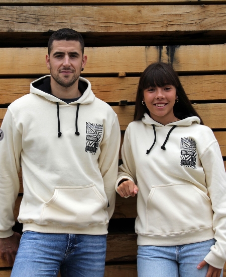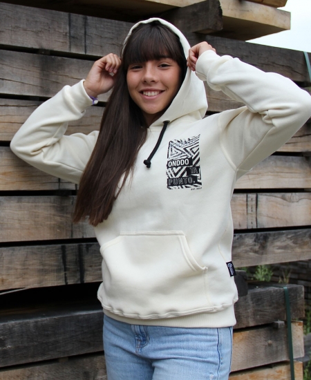 - Color: beige claro. Cordones y forro de la capucha en negro.