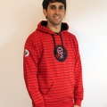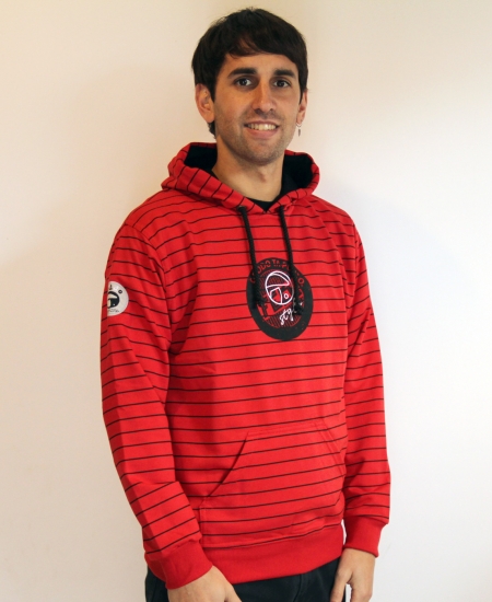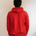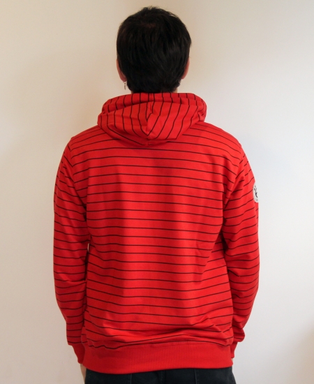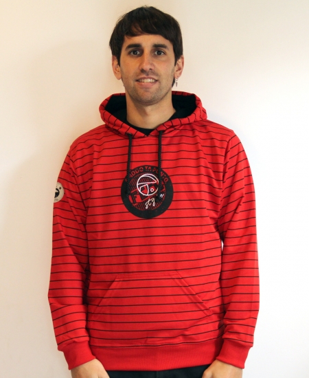 - Color: rojo con rayas negras y cordones y forro de la capucha en negro.