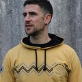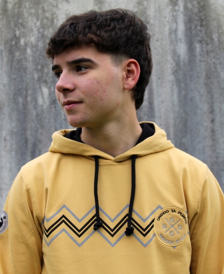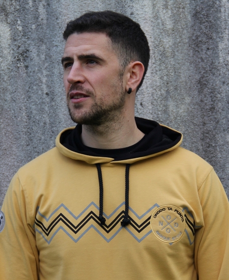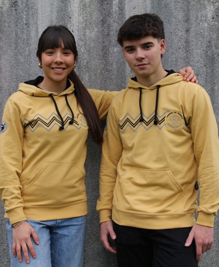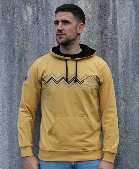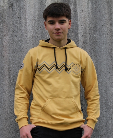 - Color: amarillo. Cordones y forro de la capucha en negro.
