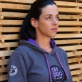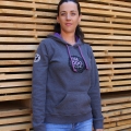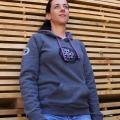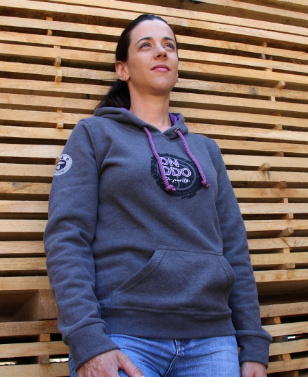 - Color: gris con cordones y forro de la capucha en morado.