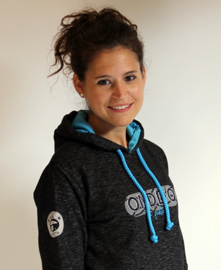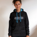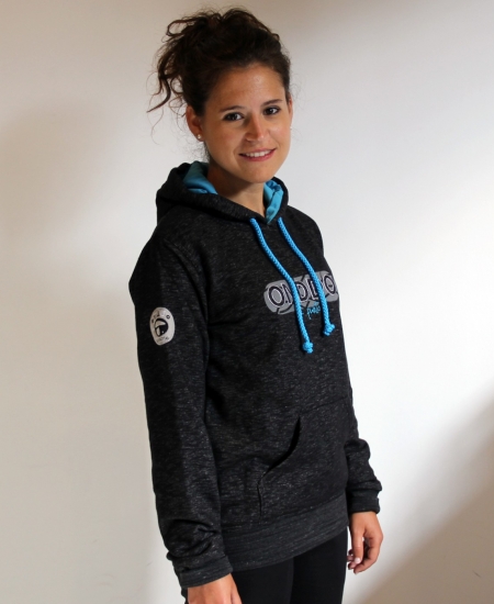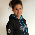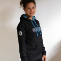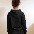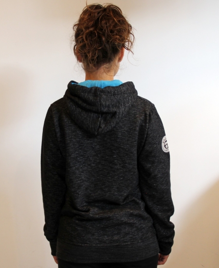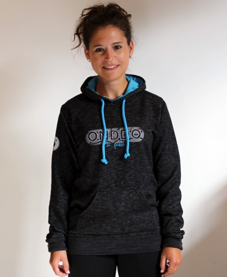 - Color: negro jaspeado y cordones y forro de la capucha en azul turquesa.
