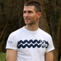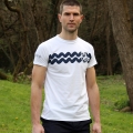 - Marrazkia estanpatua alde batetik bestera urdin marinoa eta aplikazio txuria bordatu grisarekin.